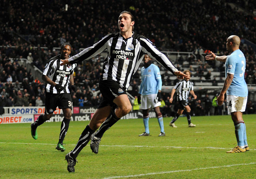 Andy Carroll of Newcastle United celebrates after scoring against Manchester City